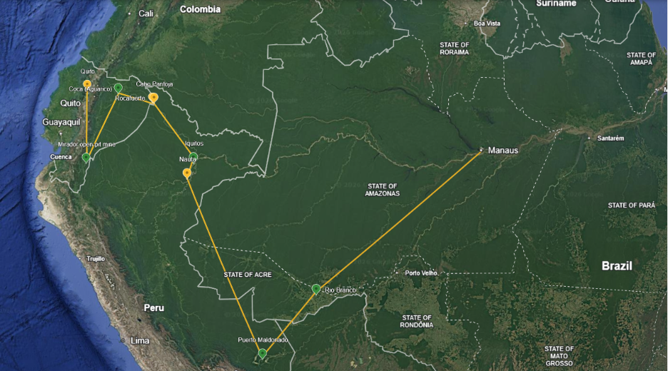 The journey began in Quito, the capital of Ecuador and a political and legal hub for struggles over the Amazon’s future, before moving south to Mirador – arguably the most emblematic open-pit mining project in the Pan-Amazon – and then north and east into the oil‑laden landscapes surrounding Yasuní National Park, one of the most biodiverse regions on Earth and simultaneously the biggest oil reserve in the country. Navigating south down the Napo River, we headed to the Peruvian capital of the Amazon: Iquitos, a city reachable only by water or air, and then continued into Madre de Dios, the Amazonian epicenter of illegal gold mining. A long overland journey northward took us into Brazil’s state of Acre, where we saw the forest suddenly disappear in front of our very eyes and extensive cattle ranching emerge in its stead. Our final stop was Manaus, a 2.28 million metropolis that rose to prominence with the rubber boom in the 19th century and stands as a symbol of the waxing and waning of extractivist fortunes in the Amazon.